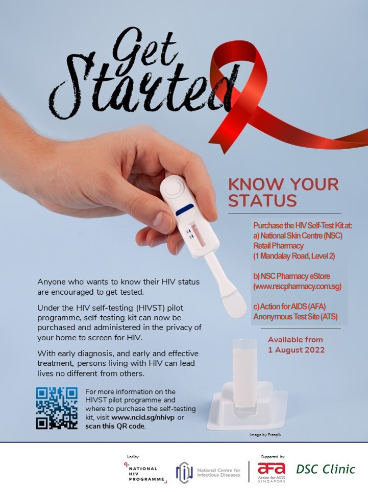 Anyone who wants to know their HIV status are encouraged to get tested. The National HIV Programme, together with our partners at Department of Sexually Transmitted Infections Control (DSC) Clinic and Action for AIDS (AfA), will be introducing HIV self-testing to complement existing testing modalities in Singapore. The pilot programme aims to encourage individuals at risk to be tested, in turn increasing early diagnosis and early treatment for persons living with HIV. HIV Self-Test Kit can be purchased from NSC Retail Pharmacy (NSC Level 2), NSC Pharmacy eStore (www.nscpharmacy.com.sg), and AFA, and administered in the privacy of the individual’s home..