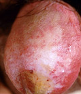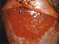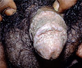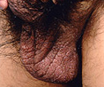 Repeated scratching can cause breaks in the skin and secondary infection. Over the scrotum, the skin can become very thickened, and can sometimes resemble 'elephant skin'. This is a process called 'lichenification'.