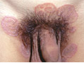 There are usually manifestations of psoriasis elsewhere on the body. Psoriasis is a chronic skin disorder that also affects the scalp and nails. It causes pinkish spots or small patches to appear on the genitalia, and may be itchy and scaly.