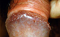 This presents as a balanitis in males. It appears as a moist, shiny, erythematous, well-demarcated plaque on the glans penis. It is benign and can be treated with a topical corticosteroid. However, a biopsy is often required to differentiate it from erythroplasia of Queyrat, which is a type of cancer occurring on the penis. Nearly all cases occur in uncircumcised males. Cause of this condition is unknown.