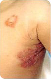 The infection appears as skin blisters which later break down to become superficial sores with golden-yellow "stuck on" crusts on the surface. Common sites affected are the face, arms, buttocks and legs.