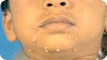 - The infection presents as small discrete, round, pearly-white growths on the skin.