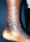 Dry skin has a rough and finely flaking or scaly surface. These are seen in the upper back and the limbs, especially the shins. Sometimes asteatotic eczema occurs in areas of dry skin. These are seen as poorly demarcated, scaly round red patches. Sometimes a distinctive appearance of red scaly fissures in an irregular netlike pattern resembling cracked porcelain is seen.